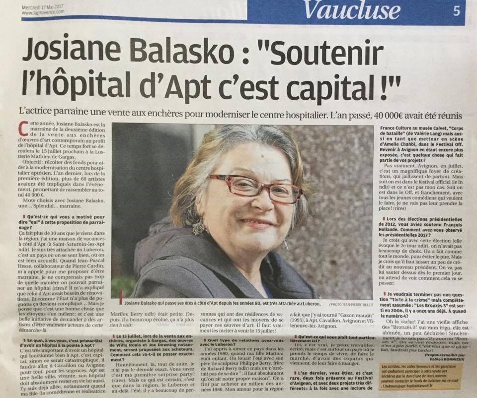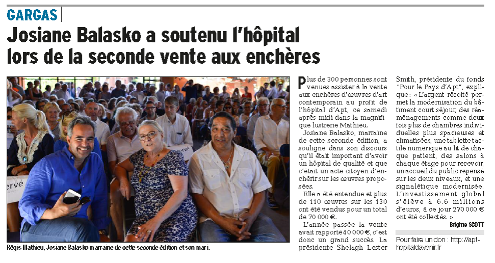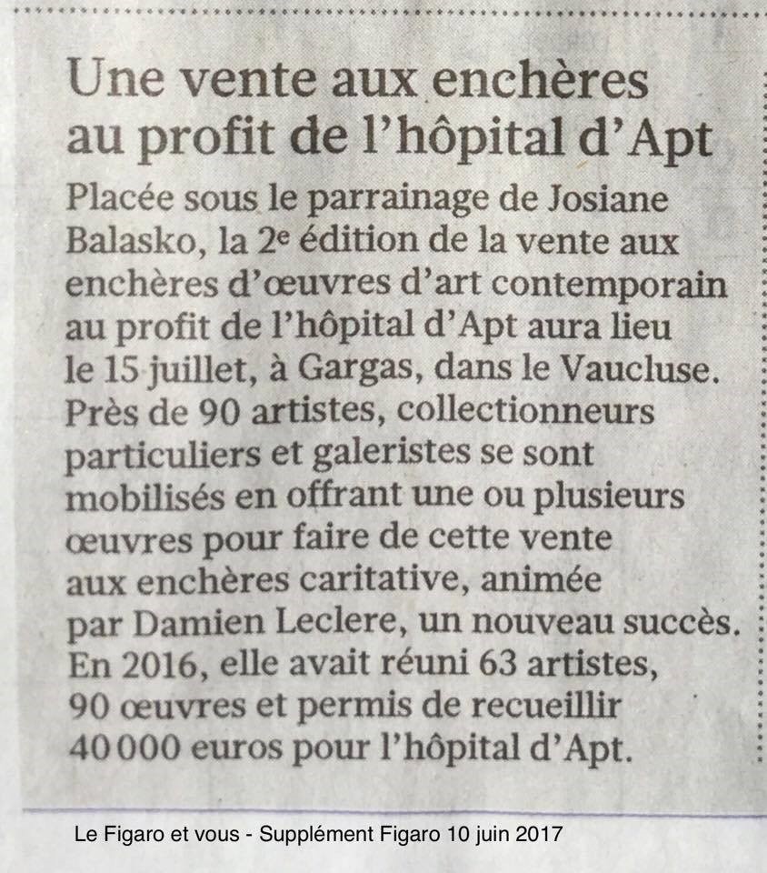 CENT-TRENTE ŒUVRES D’ART POUR LA VENTE AUX ENCHÈRES D’ŒUVRES D’ART CONTEMPORAIN 2017 AU PROFIT DE L’HOPITAL D’APT VENTE PARRAINEE PAR JOSIANE BALASKO SAMEDI 15 JUILLET 18h00 à la LUSTRERIE MATHIEU (84)